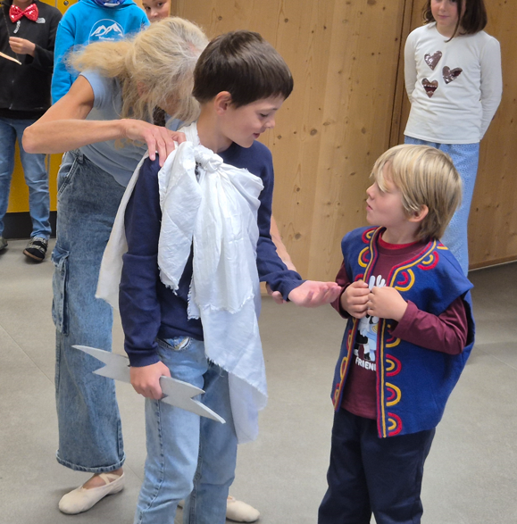 Wie jedes Jahr bekamen die Kinder auch heuer wieder besuch von Sabine und Antonia vom Mozartensemble Luzern. Mit im Gepäck hatten sie dieses Jahr Griechische Sagen und die Musik von Jacques Offenbach. Einige Schüler/innen durften wieder in ein Kostüm schlüpfen und die Rolle einer griechischen Göttin, eines Gottes oder einer anderen Sagengestalt einnehmen. Nach einer kurzen Besprechung zauberten die Kinder wieder ein tolles Theaterstück auf die Bühne.